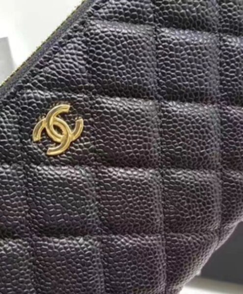 Features classic quilted pattern in textured caviar leather with runaround silver closure.Silver CC on front,interior has two open compartments,one central
