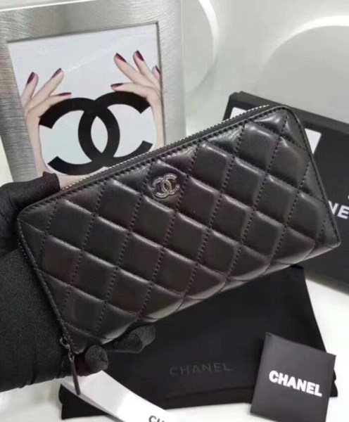 Features classic quilted pattern in lambskin with runaround silver closure.Silver CC on front, interior has two open compartments,one central