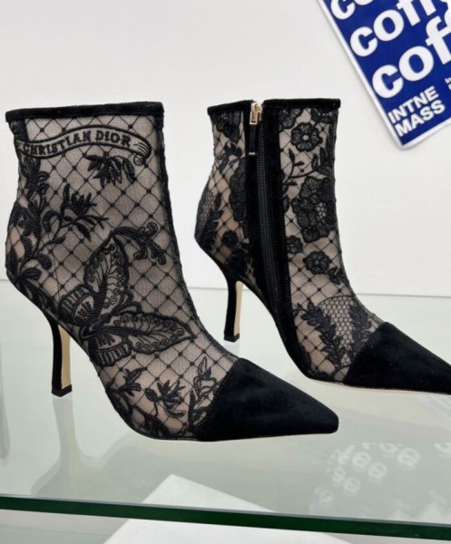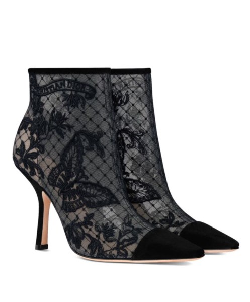 The Dior Capture ankle boot is a delicate creation inspired by the collection’s signature animal. Offering a sophisticated element of transparency, the mesh style is fully embroidered with a Butterfly motif embellished with a Christian Dior signature and suede calfskin details. A 10 cm (4) comma heel adds the finishing touch to the refined shoe that’s ideal for evening wear looks.