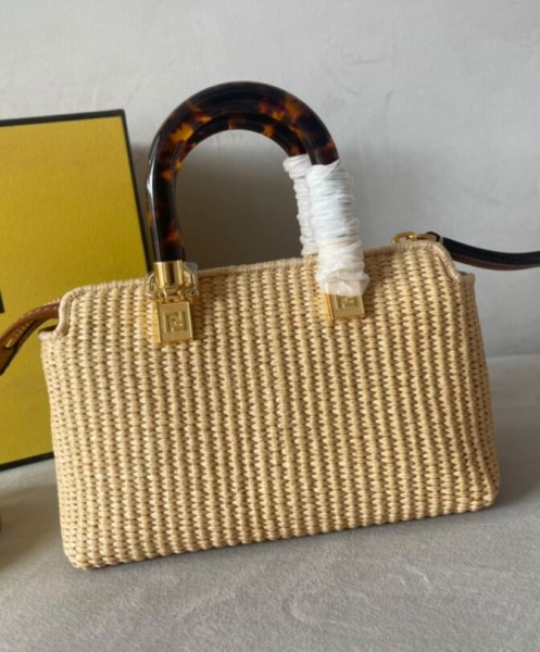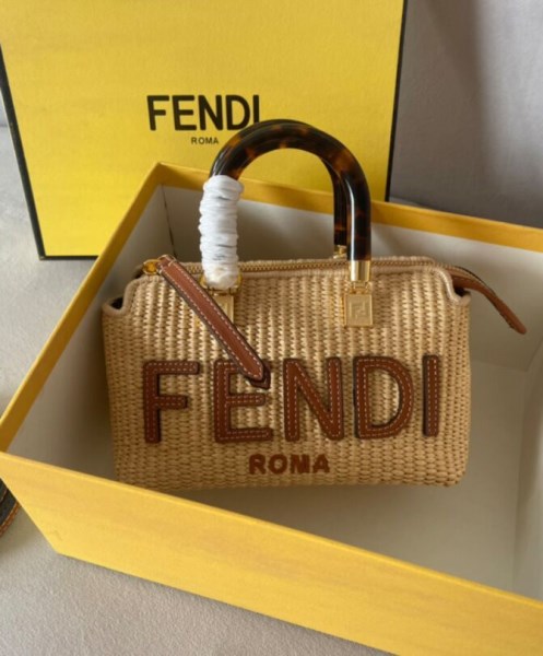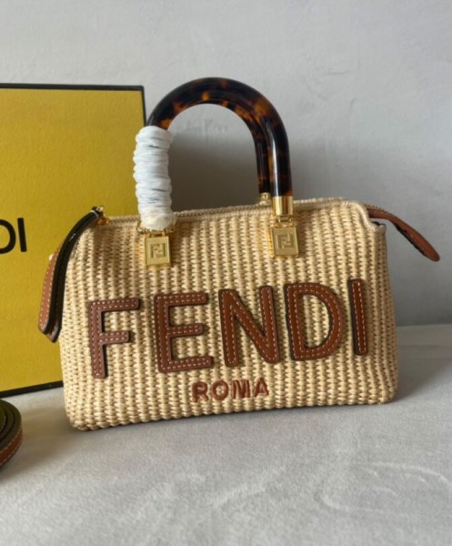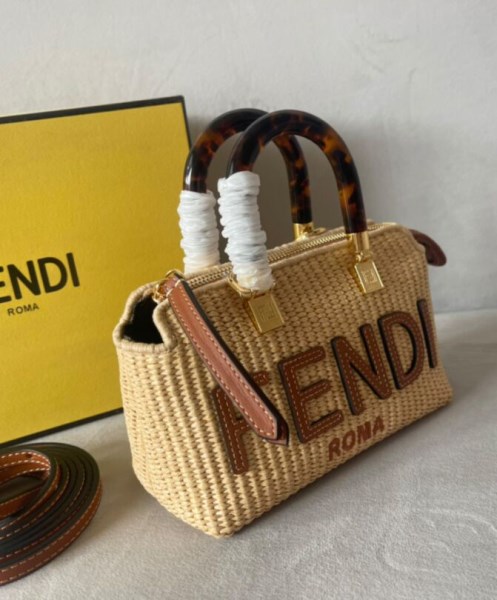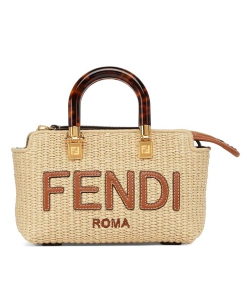 Iconic mini By The Way Boston bag, made of natural-coloured straw woven in a moss-stitch effect with the FENDI ROMA lettering in leather. Stiff tortoiseshell-effect plexiglass handles. Zip fastening.