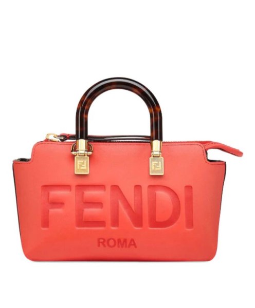 Iconic mini By The Way Boston bag made of leather with hot-stamped FENDI ROMA lettering and rigid tortoiseshell-effect plexiglass handles. Zip fastening.