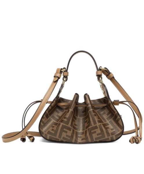 Mini bag with drawstring closure in PU fabric with brown FF print. Decorated with beige leather details. Comes with interior compartment and gold-tone hardware. Equipped with a handle or detachable shoulder strap, it can be carried by hand, over the shoulder or cross-body.