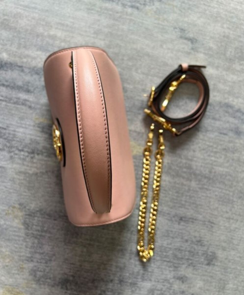 Coming from the House’s archives, a geometrically shaped version of the Round Interlocking G logo adorns this small top-handle bag. The versatile nature of the design adds a contemporary note to the vintage aesthetic of the metal chain and buckle closure.