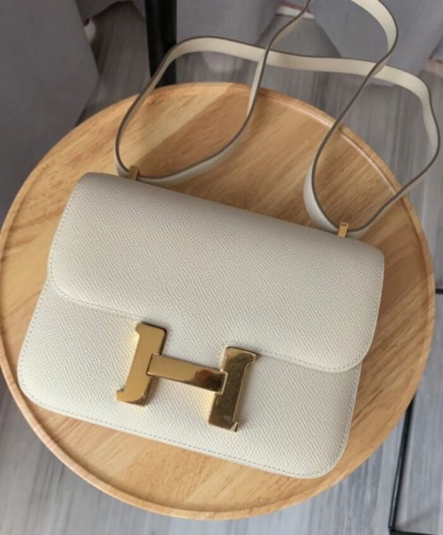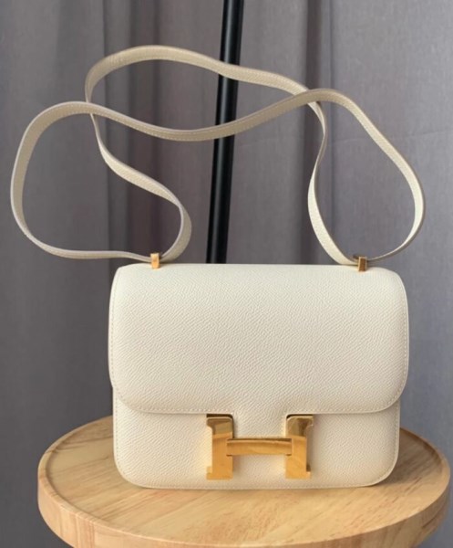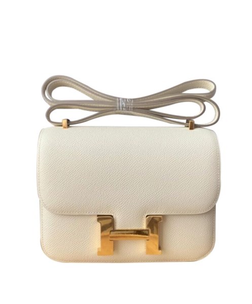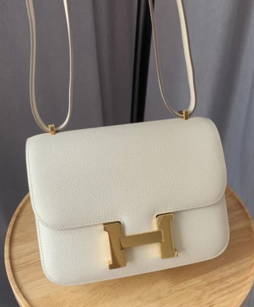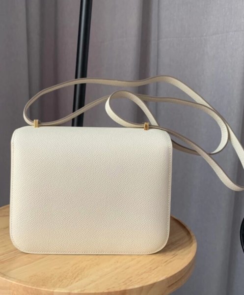 This Constance is in Feu epsom leather with palladium hardware and has tonal stitching, a metal “H” snap lock closure and adjustable shoulder strap.