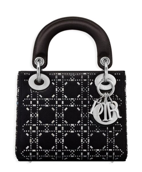 The Lady Dior handbag epitomizes Dior’s vision of elegance and beauty. A sleek, refined bag, it is timeless yet modern. Crafted from satin, the design is embroidered with strass for sophisticated evening allure. The palladium-finish metal signature’DIOR’ charms further embellish its silhouette. The mini style has a thin removable shoulder strap.
