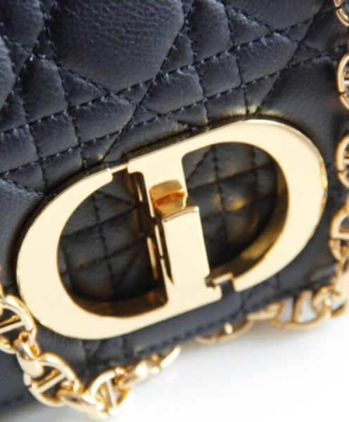 The new Dior Caro bag boasts Cannage stitching on soft calfskin, showcasing the instantly recognizable quilted texture. The supple bag features a flap with the twist ‘CD’ clasp, inspired by the seal of a Christian Dior perfume bottle, styled in antique gold-finish metal. The removable signature ‘CD’ chain link shoulder strap can be replaced with a wide embroidered strap, allowing the small style to be worn during both the day and the evening in a modern, elegant look.