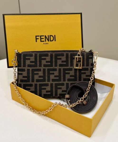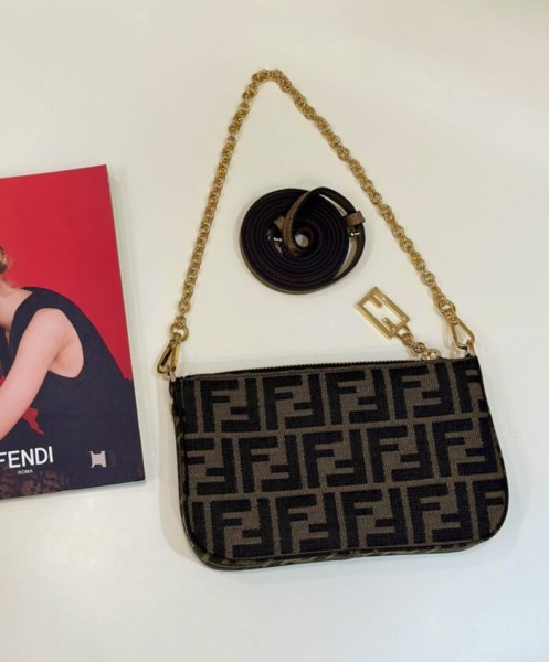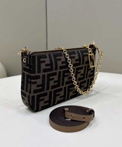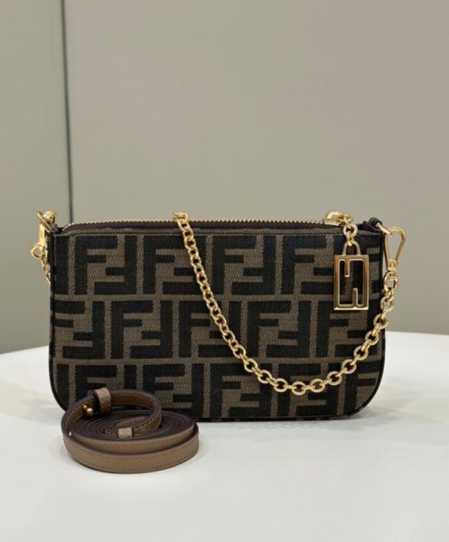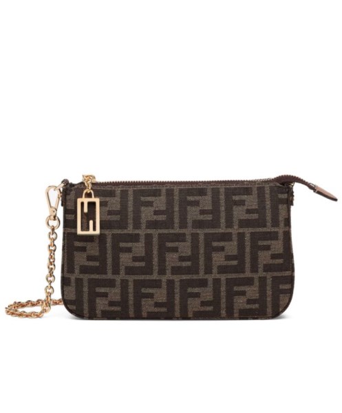 Baguette clutch bag with thin, detachable chain, to carry by hand or wear under the arm. Closed by zip and zip-pull with iconic FF motif. Made of fabric with jacquard FF in brown and tobacco. Gold-finish metalware.