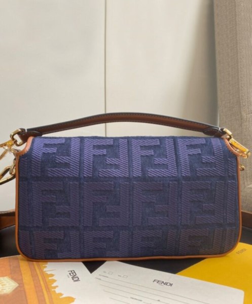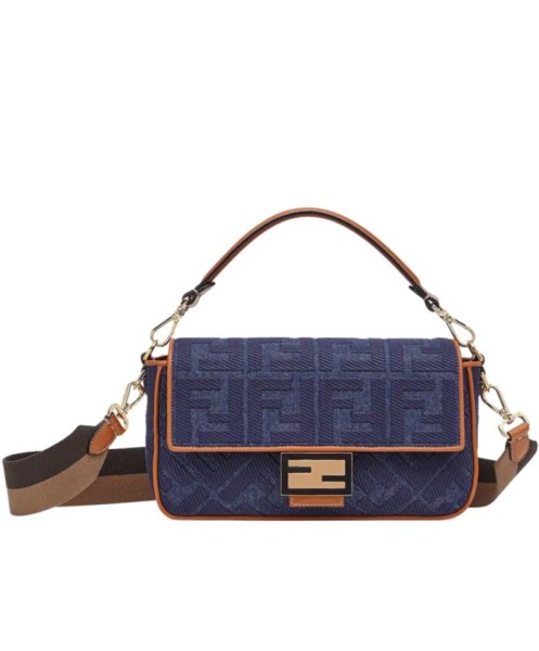 Iconic medium Baguette bag made of canvas with an embossed FF motif created with tone on tone embroidery, trimmed in dark leather and adorned with an FF clasp.