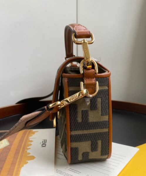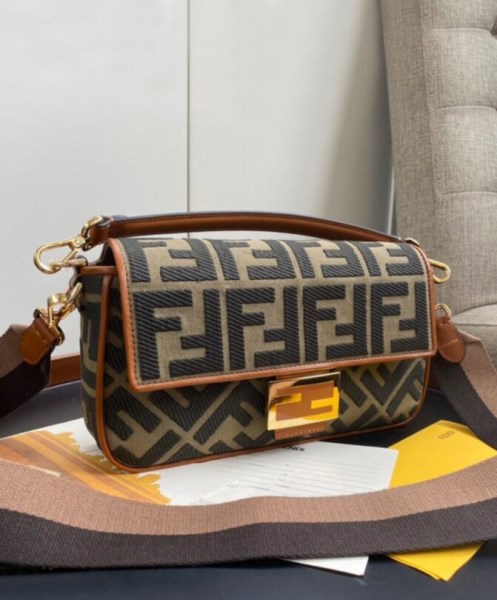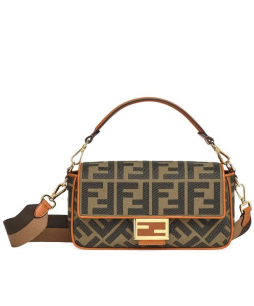 Iconic medium Baguette bag made of canvas with an embossed FF motif created with tone on tone embroidery, trimmed in dark leather and adorned with an FF clasp.