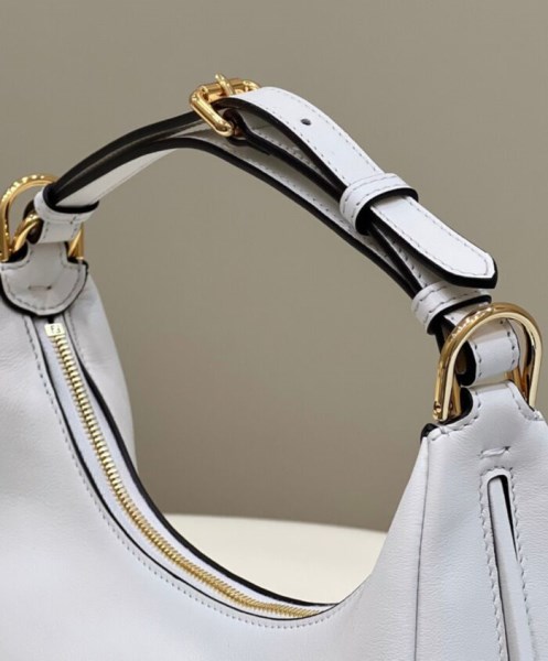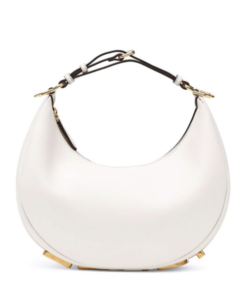 Small Hobo bag made of soft laminated leather with a craquele effect. With vintage gold metal FENDI lettering visible when the bag is worn under the arm.
