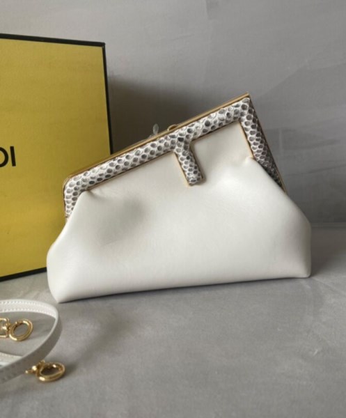 Small Fendi First bag made of soft nappa leather with oversized metal F clasp bound in tone on tone python leather.