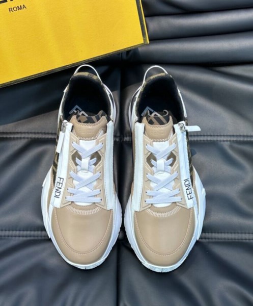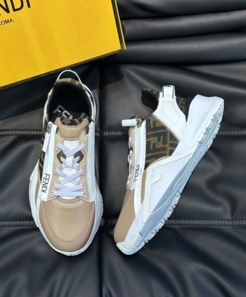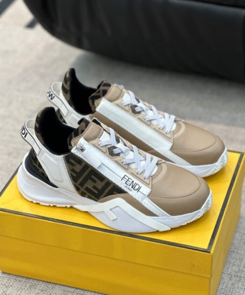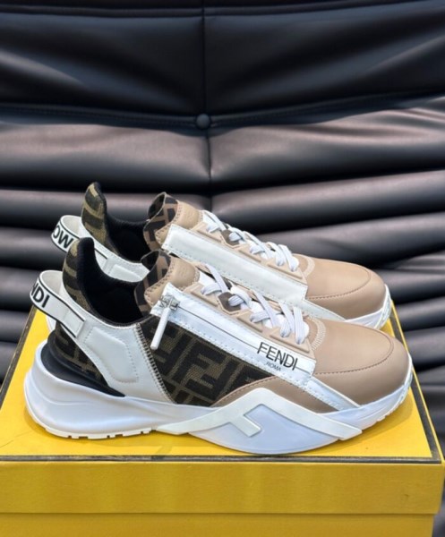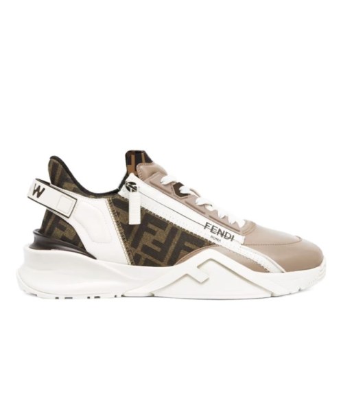 Fendi Flow sneakers with adjustable elastic laces and side zip fastening. Branded with FF pattern on the tongue and rubber tab with embossed logo on the back of the heel. Made of leather. FF fabric detailing. 35 mm running sole with diagonal F detail.