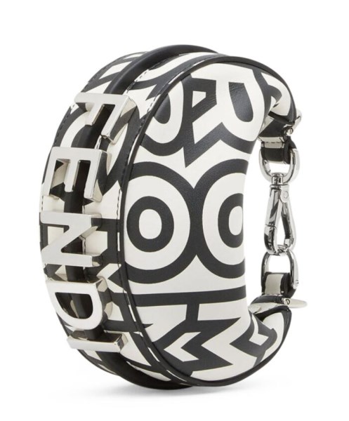 Fendigraphy nano version hobo bag with zipper closure, embellished with palladium-coloured metallic FENDI lettering. The adjustable strap with a clip allows it to be attached to larger bags or worn on the wrist. Comes with hooks for the shoulder strap. Made of printed leather with the Fendi Roma logo in white and black, reinterpreted by Marc Jacobs in an all-over oversized style. Palladium-finish metalware.