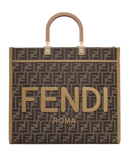 Sunshine Shopper bag made of fabric with brown FF jacquard motif and FENDI ROMA lettering in light brown leather and stiff tortoiseshell-effect plexiglass handles.