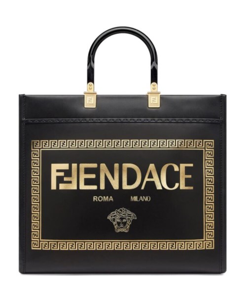 Medium Sunshine shopper made of leather with a laminated print with the Fendace logo, a symbol of the collection born of the creative collaboration between Fendi and Versace. Black plexiglass stiff handles.