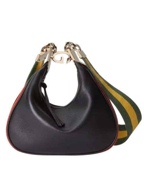 An ode to the timeless Hollywood glamour that shaped Gucci Love Parade, classic elements from the House’s archives are reintroduced. Distinguished by its crescent moon shape, the accessory is further defined by a G shaped hook closure. Paired with soft materials, the heritage hardware creates a refined design with vintage appeal. This small version is crafted in leather with Web trim.