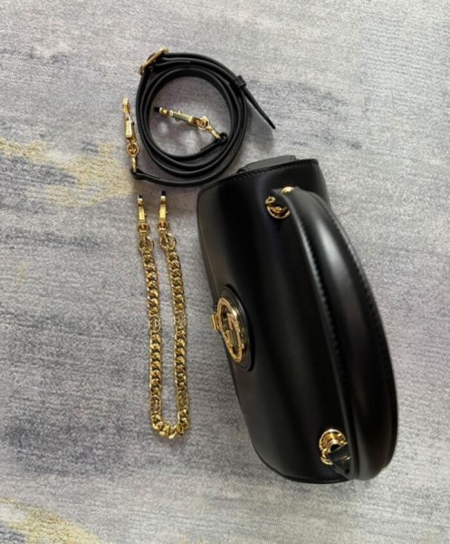 Coming from the House’s archives, a geometrically shaped version of the Round Interlocking G logo adorns this small top-handle bag. The versatile nature of the design adds a contemporary note to the vintage aesthetic of the metal chain and buckle closure.
