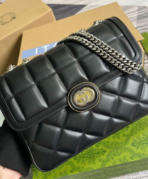 Fascinated with the past, Gucci continues to expand its horizons by revisiting classic silhouettes and refined materials. With their quilted design, the new bags highlight emblematic symbols from the archive for a retro feel, such as Interlocking G hardware on the flap closure, ’70s-inspired leather trim, and a chain shoulder strap, like this shoulder bag.