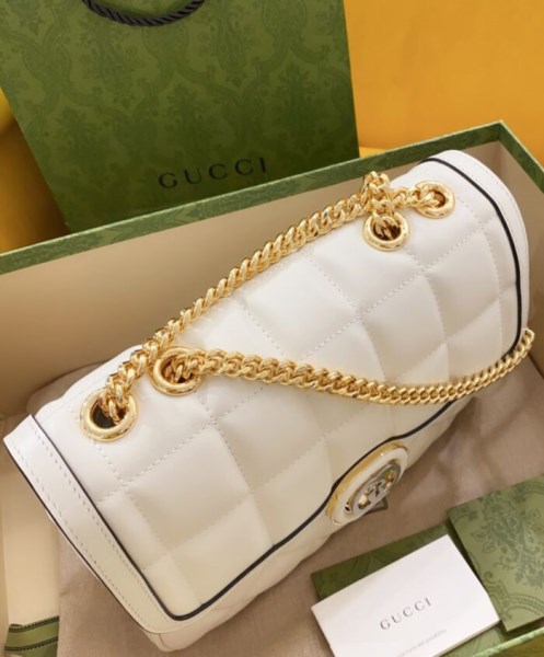 Fascinated with the past, Gucci continues to expand its horizons by revisiting classic silhouettes and refined materials. With their quilted design, the new bags highlight emblematic symbols from the archive for a retro feel, such as Interlocking G hardware on the flap closure, ’70s-inspired leather trim, and a chain shoulder strap, like this shoulder bag.