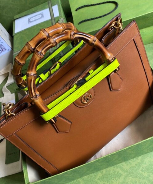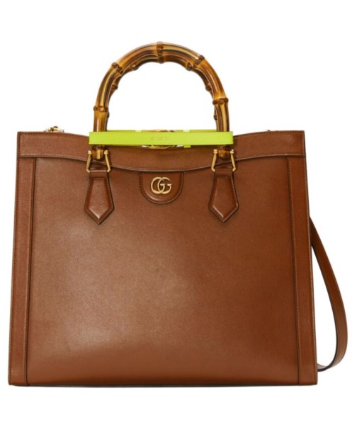 Combining recognizable elements of the House, the medium-sized tote bag is defined by its bamboo handles and Double G hardware. Crafted from brown leather, the accessory is further accentuated by two neon bands, a playful reference to the bands used to keep handles in shape.