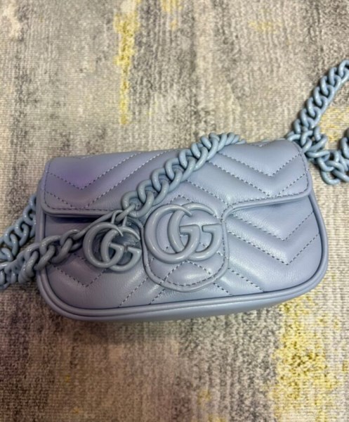 A part of the Beloved family, a collection of styles held dear to the House, the GG Marmont is reimagined in pale blue. The pastel shade adds a whimsical element to the style, reinterpreting the archival hardware with a romantic feel.