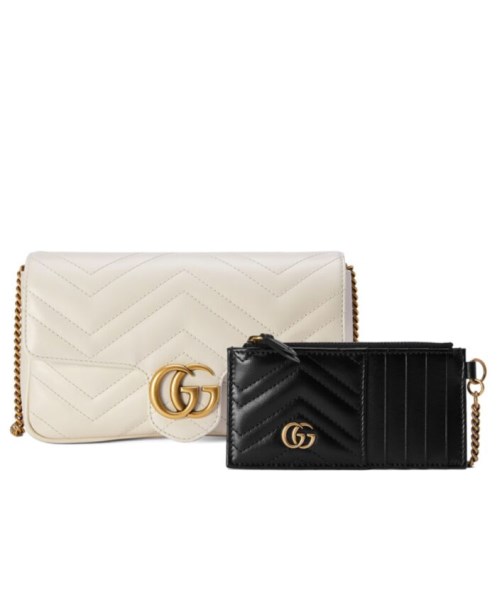 The Double G hardware brings the past into the House’s present with the notion that a cherished wardrobe is enriched by items that can be worn season after season. This mini card case wallet with a chain strap is crafted from the signature matelasse chevron leather, while the inside features a contrasting leather card case that can be detached.