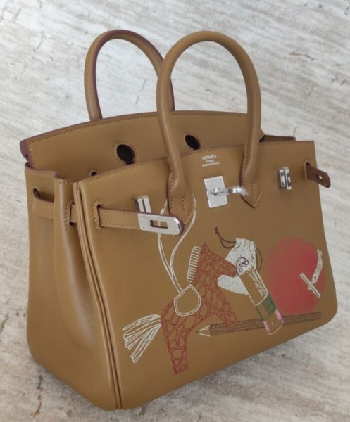 This Limited Edition Birkin is in Biscuit swift leather with palladium hardware and has tonal stitching, front graphics of a rodeo charm, lipstick, pencil, coin purse and other small items found inside a bag, front flap, two straps with center toggle closure, clochette with lock and two keys, and double rolled handles.