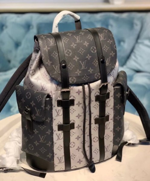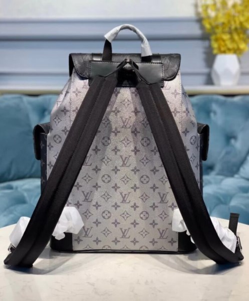 The Christopher PM backpack reinvents the rugged spirit of a hiking pack in masculine Monogram Eclipse canvas and Monogram Eclipse Reverse canvas with black leather trim. The grays and blacks are complemented by the silver highlights of the buckles and zips. Multiple pockets and a leather flap with a press-stud keep belongings safe.