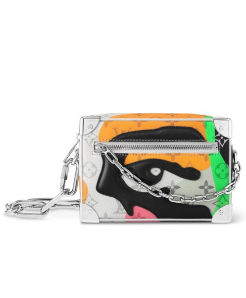 This Mini Soft Trunk is made from canvas and leather with a patchwork print that seems to create part of a face. An effect amplified by the leather patch in the form of an eye that is stitched onto the canvas. The reinforced corners, decorative chain, and chain on the adjustable strap are all a silver color.