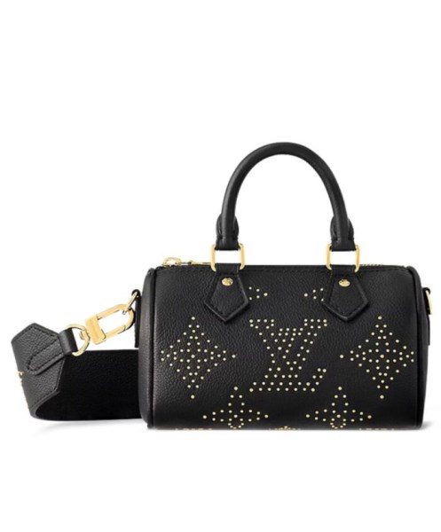 With a Monogram motif created from golden studs on grained cowhide leather, the Nano Speedy has a glamorous edge. This tiny handbag has two rolled-leather top handles and a removable strap, also embellished with gold-color studs that create Monogram Blossoms. Zip closure keeps belongings secure inside.