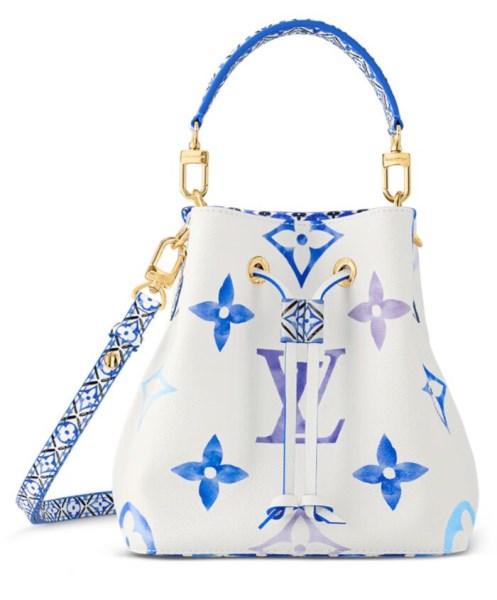 canvas with a Giant Monogram print in pastel brings a resort vibe to this NeoNoe bucket bag. The LV’s and Monogram Flowers seem to be painted on the canvas in watercolor and explore soft nuances of tone. The NeoNoe closes with a drawstring. Inside there’s a central pocket with a press stud.