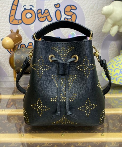 The NeoNoe BB bucket bag features an edgy version of the Monogram pattern formed with studs, each coated with 0.25 microns of gold. This compact bag is just the right size for belongings like a phone, keys, and a wallet. There’s a detachable top handle for hand and elbow carry as well as a removable shoulder strap.