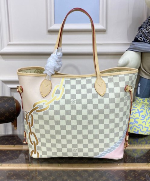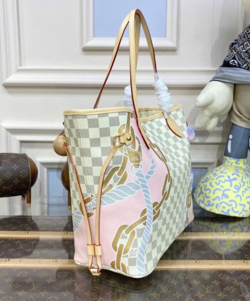 This Neverfull MM tote bag is made from Damier Azur coated canvas customized with a bold five-color nautical print of ropes and chains, bringing a fresh twist to the classic checkerboard pattern. This versatile bag features side laces that can be cinched for a sleeker silhouette or loosened for a more casual look.
