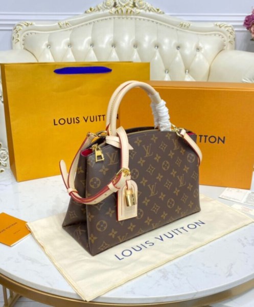 The timelessly feminine Petit Palais tote bag is made from Monogram canvas, trimmed with natural leather, and lined in a lush red textile. A removable and adjustable strap, in addition to Toron top handles, enables multiple carrying options. The gold-color padlock on the luggage tag evokes the House’s travel heritage