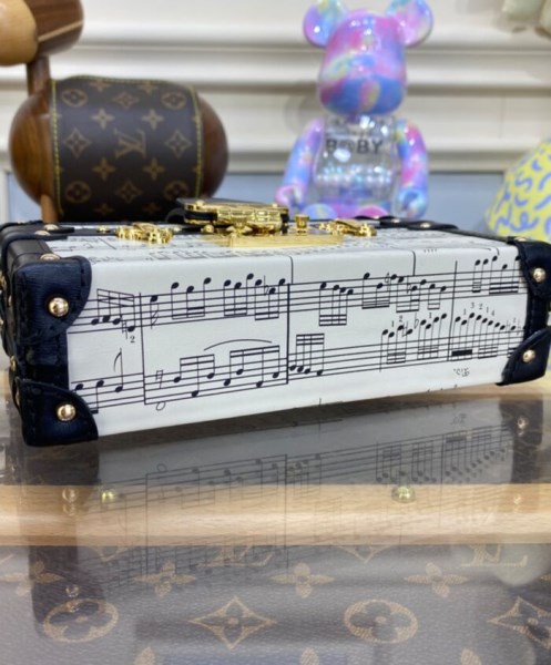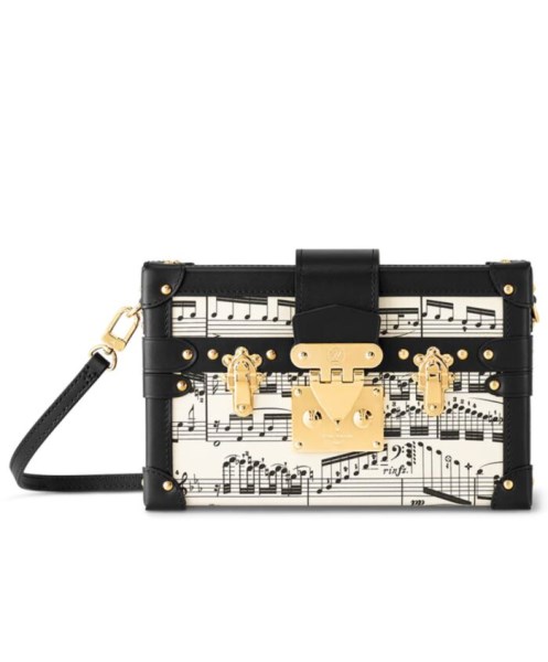 The season’s LV Symphony theme decorates this exclusive edition of the Petite Malle handbag: a rich graphic design of musical notation is punctuated by Louis Vuitton signatures in vivid red. Made from fine-grained calfskin the Petite malle is fitted with gold-finish hardware that recalls the Maison’s historic luggage. Collectors, take note.