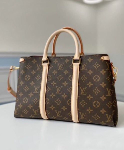 Made from Monogram canvas and featuring two lateral leather bands inspired by the iconic Keepall, the new Soufflot MM has a spacious, well-organized interior. It can be carried by hand and on the elbow with its articulated leather top handles, or on the shoulder, thanks to its removable and adjustable shoulder strap.