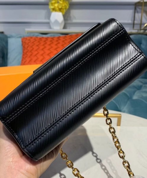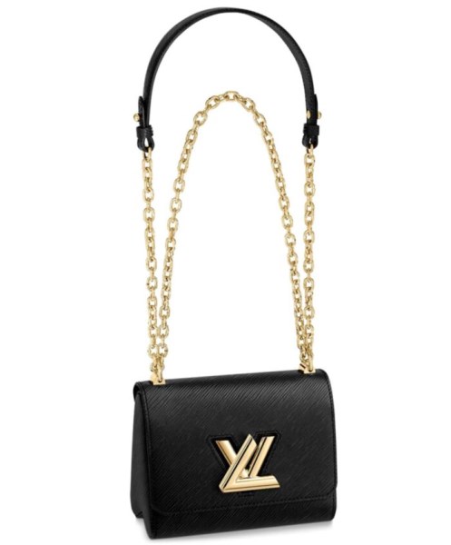 This Twist PM chain bag in grained Epi leather is accented with the now-iconic LV Twist lock, a sculptural signature in gleaming golden metal. Compact but surprisingly roomy thanks to the cleverly designed ??wave?? base, this beautifully crafted piece is a fashionable day-to-evening companion. The sliding chain strap can be doubled for shoulder carry or lengthened for cross-body wear. A New Classic of the House, the Twist bag was introduced at the 2015 Cruise show.