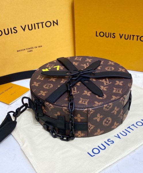 The distinctive round shape and leather straps of the Wheel Box recall the House’s historic Chauffeur hatbox from 1905, designed especially for limousines. Classic Monogram canvas is accented with a bright yellow N 7 in honor of Virgil Abloh’s Spring-Summer 2022 collection, his seventh for Louis Vuitton. A versatile everyday bag, it’s the contemporary way to carry personal essentials.