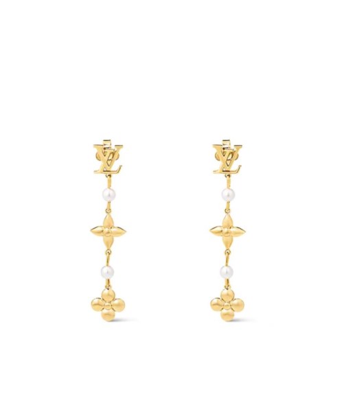 The delicate design of the Louisa earrings combines iconic House emblems with the timeless symbolism of the pearl. Crafted in gold-finish metal, they feature two different Monogram Flowers separated by lustrous white resin pearls, hanging from studs that spell out the LV Initials. Light and comfortable, they add a touch of sophistication to formal or everyday looks.