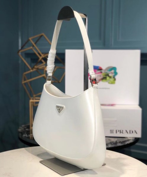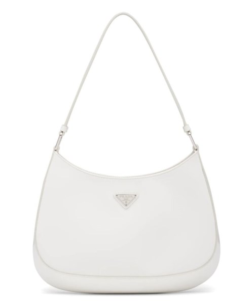 The Prada Cleo bag with sophisticated allure reinterprets an iconic design of the brand from the 1990’s. Sleek curved lines emphasized by the particular construction rounded on the bottom and sides give this hobo bag a soft, light look. Brushed leather, a modern and versatile material that is distinctive in Prada collections, is ideal for creating always new combinations and contrasts. The enamel triangle logo decorates the silhouette.