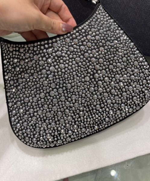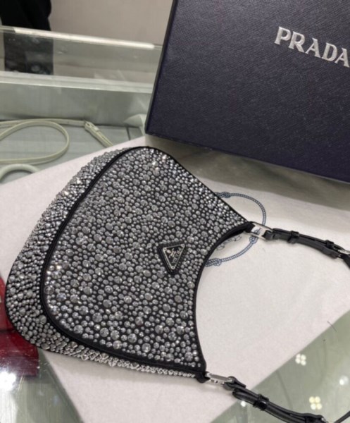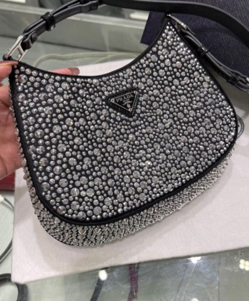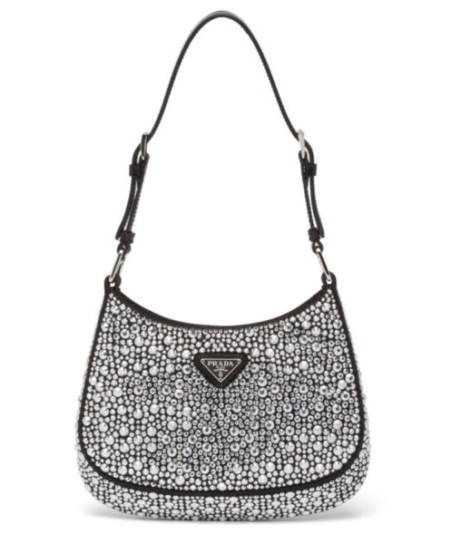 Feminine, elegant and modern, the Prada Cleo bag is made of satin and embellished with luminous crystals of different sizes that give the bag refined charm. The sinuous shape that recalls archive styles makes the accessory iconic.