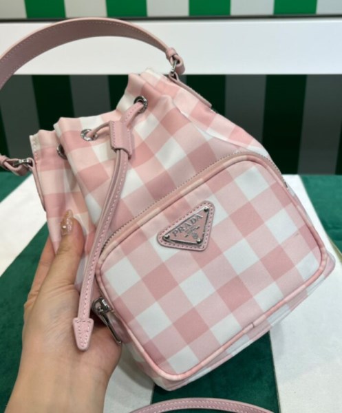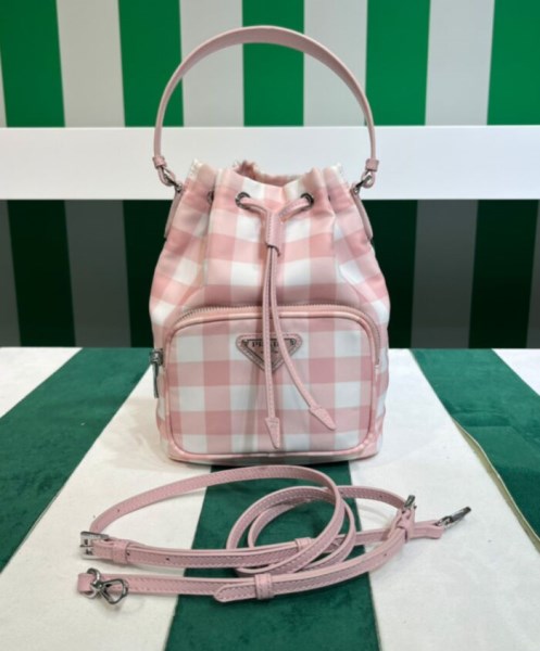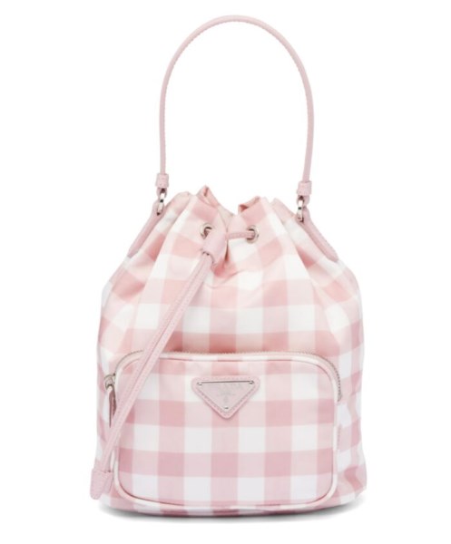 This bucket bag has a modern, feminine design. The Prada Duet bag with leather handle and metal hardware is enhanced with an alluring summery print that is a macro version of the classic gingham check. The iconic enameled metal triangle logo, which first appeared in 1913 on trunks designed by Mario Prada, decorates the accessory.