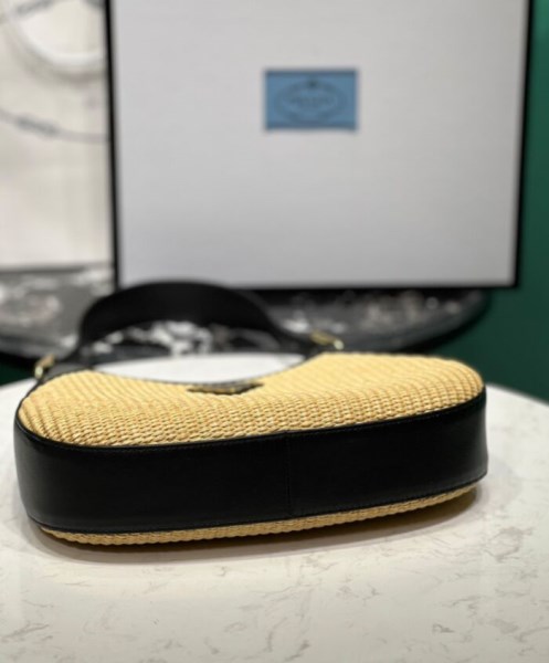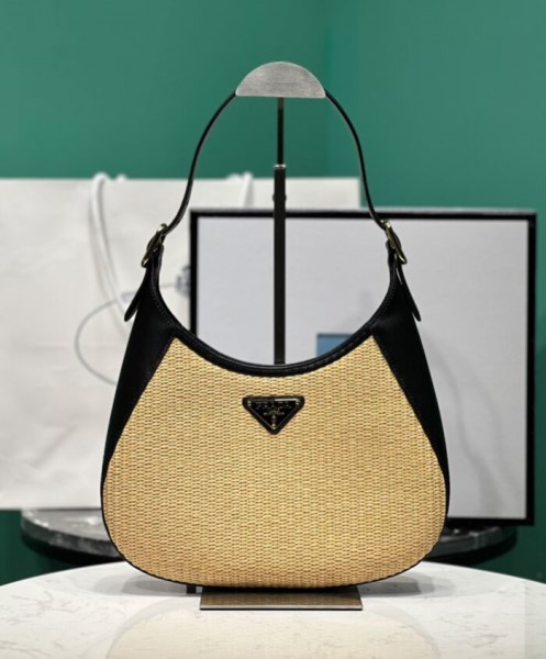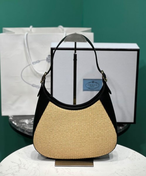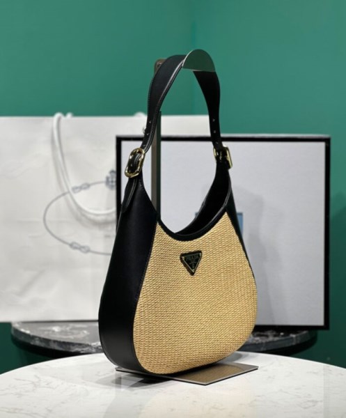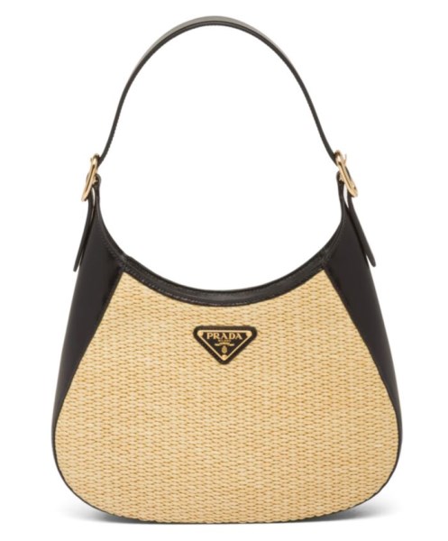 A bold and refined silhouette characterizes this straw and leather shoulder bag with elegant details. The geometric construction contrasts with the soft lines, creating a modern and elegant accessory that expresses the hybrid concept, which is part of Prada’s aesthetic code.