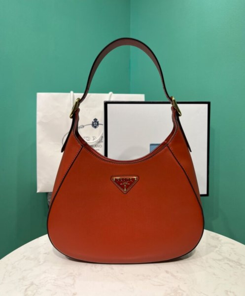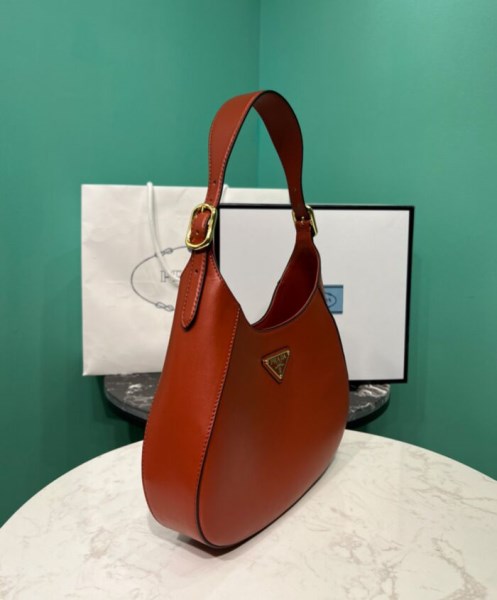 A bold and refined silhouette characterizes this leather shoulder bag with fine details. The geometric construction contrasts with soft lines to create a modern and elegant yet sporty bag, an expression of the hybrid concept and part of the Prada’s aesthetic code.
