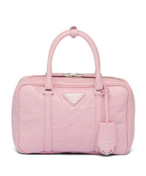 This bag with casual, classic allure is made of glossy nappa leather with a natural finish. The handmade wrinkled effect contrasts with the concept of a rigid construction, reinterpreting an everyday object that can be worn without constraints. Presented for the Spring Summer 2023 collection, the accessory that is a re-edition of a bag presented in 2001 is decorated with the enameled metal triangle logo.