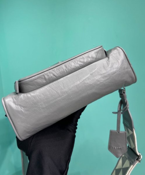 This bag with compact allure is made of nappa leather with a natural, glossy finish. The hand-made wrinkled effect contrasts with the constructed and rigid concept, reinterpreting an everyday object to be worn without constraints. Presented in the Spring Summer 2023 show, the style is accented with a finely embroidered shoulder strap with a sporty mood.
