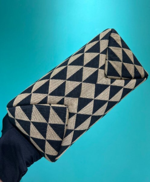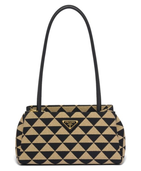 A study of the lines characterizes this small leather handbag. It stands out for its absolutely elegant silhouette emphasized by the long, narrow leather handle. The triangle becomes a luxurious modern and multifaceted jacquard motif, an affirmation of Prada’s unmistakable image.