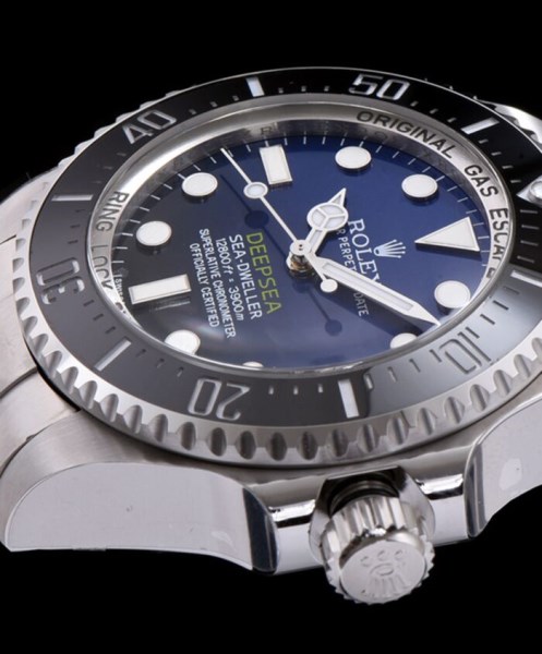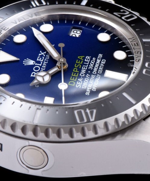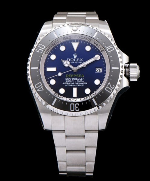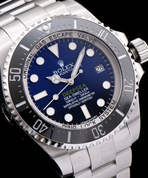 It features automatic movement,Quickset,scratch-resistant sapphire crystal,waterproof screw-down crown,water resistant to 12,800 with helium escape valve for extreme depths.Titanium caseback w/Ring Lock System,unidirectional rotatable time-lapse ceramic inner reflector ring engraved w/serial number.Black to Blue gradient w/green”DEEPSEA”lettering,luminous hour markers.Stainless steel Oyster bracelet w/Glidelock extension clasp