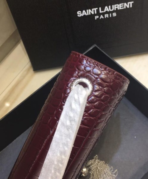 Classic monogram saint laurent shoulder bag with interlocking metal ysl signature and metal chain tassel.
