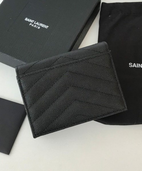 saint laurent wallet with interlaced ysl metal initials and quilted overstitching.
